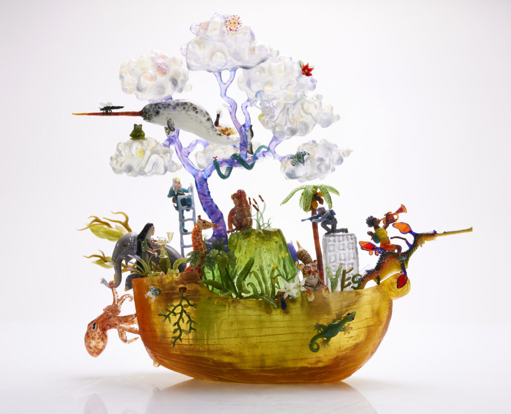 Music is very visual for me, whether it’s an undulating soundscape in some improvised jazz or the finely crafted shape of a good pop song. I might create a sculptural representation of a music solo in glass because that’s how I see it when I’m playing the saxophone. Conversely, I often feel like I’m sculpting shapes when I play music. Songs are also vessels for carrying stories, as are books, films and visual artworks.