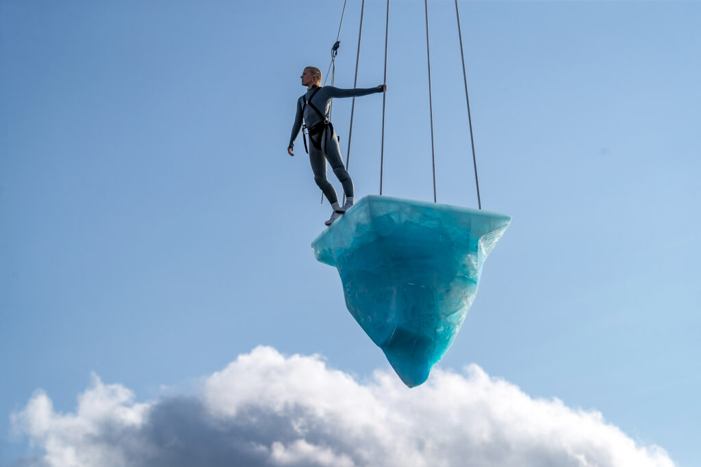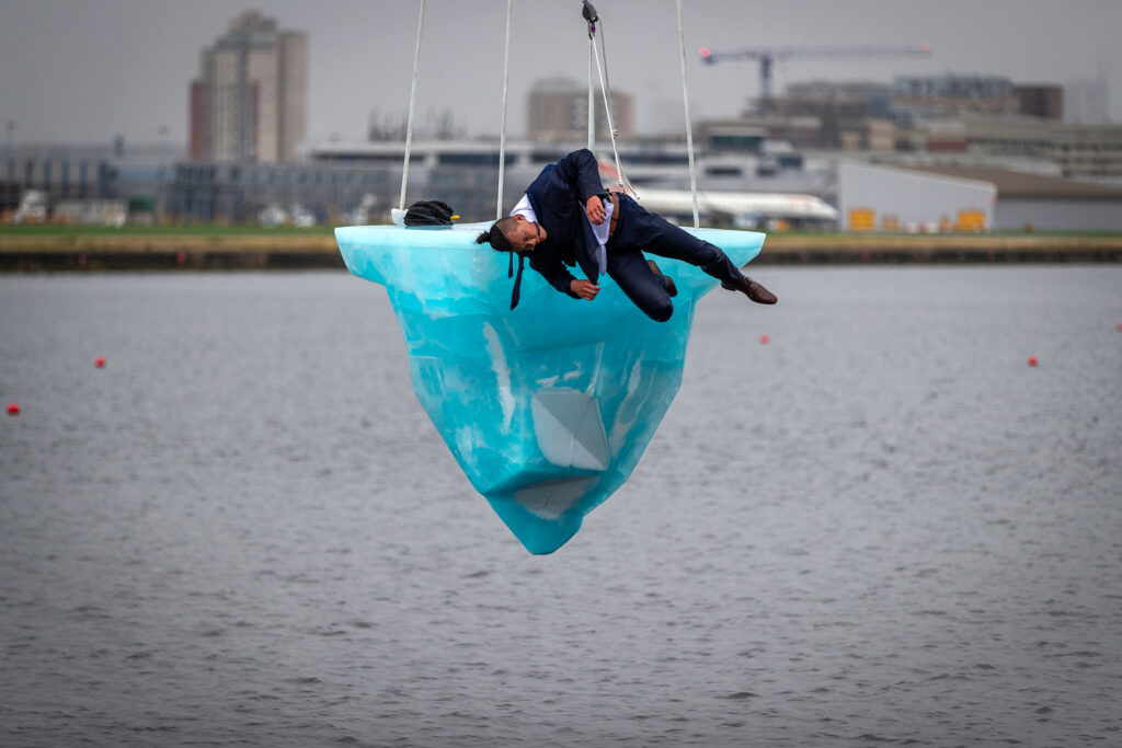 Performer sperformed for 8 hours on a 2.7 tonne melting ice sculpture which was hoisted at times 20 meters in the air to a score by the Alaskan composer Matthew Burtner.Thaw addresses humankind’s impact on the planet. The performance was part of the Greenwich and Docklands International Festival (GDIF) which is on from 23 August - 8th September. Photographer : Abdullah Bailey
