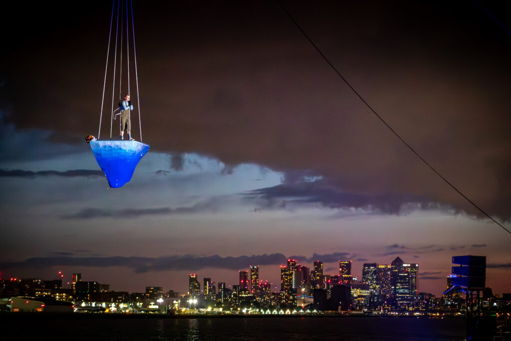 Performers performed for 8 hours on a 2.7 tonne melting ice sculpture which was hoisted at times 20 meters in the air to a score by the Alaskan composer Matthew Burtner. Thaw addresses humankind’s impact on the planet. The performance was part of the Greenwich and Docklands International Festival (GDIF) which is on from 23 August - 8th September. Photographer: Abdullah Bailey